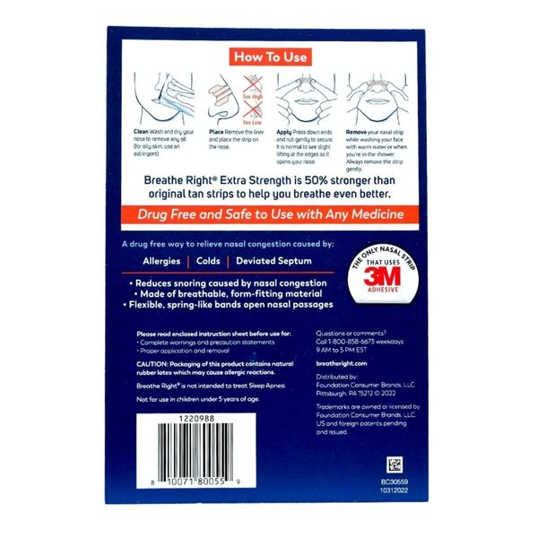 加強的帶子比普通帶子強 50%,具有更強的粘合劑,可以在整個晚上保持更長時間。每條鼻貼不含藥物,鼻帶都由一個靈活的“彈簧狀”帶組成,當正確放置在鼻子上時,能輕輕地打開鼻道,使呼吸更暢順。