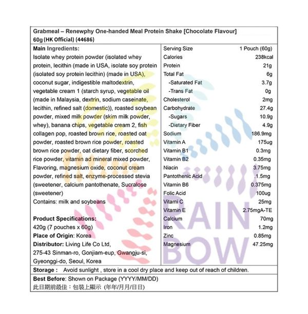 Renewphy-試食優惠價-韓國人氣爆紅-高蛋白瘦身代餐[朱古力味] 60g x1包EXP:2027年1月1日 (香港行貨)(44679)