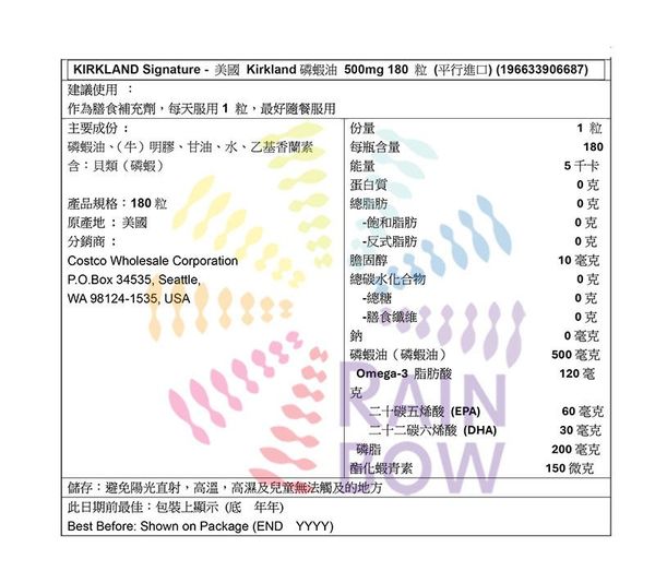 Kirkland Signature - 磷蝦油 500mg 180 粒 此日期或之前食用:2026年7月底(06687)(平行進口)