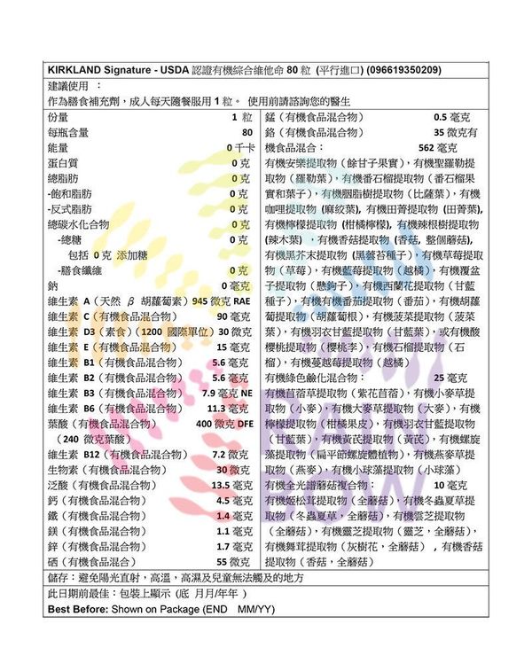 Kirkland Signature-USDA認證有機綜合維他命80粒 EXP :2026年7月底 (平行進口) (50209)