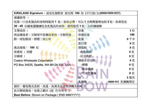 Kirkland Signature-速效乳糖酵素 補充劑 180 粒 (61537)此日期或之前食用:2026年1月(平行進口)