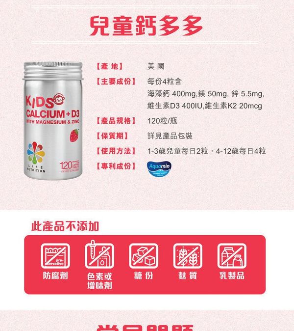 LIFE NUTRITION兒童鈣多多 是兒童的正確補鈣方法,配方採用「Aquamin®鈣質好吸收」,為專利天然海藻鈣,親和人體無副作用,