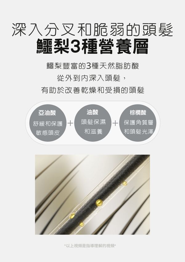採用西班牙智利鱷梨油3種豐富的天然脂肪酸可深入開叉和脆弱頭髮