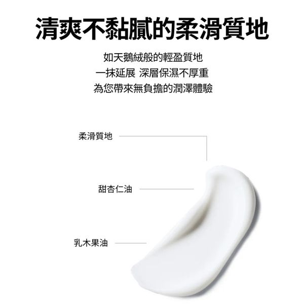 乳木果油 + 甜杏仁油:雙重天然植萃,深入滋養乾燥肌膚,重拾柔嫩水潤感。