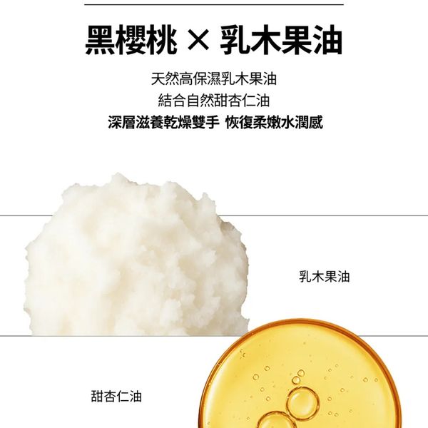 超級抗氧保濕力:來自黑櫻桃的花青素、多酚、維生素 A+C+E,幫助肌膚抗氧化、促進膠原生成,恢復手部彈嫩與光澤。