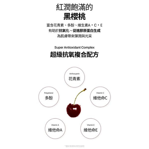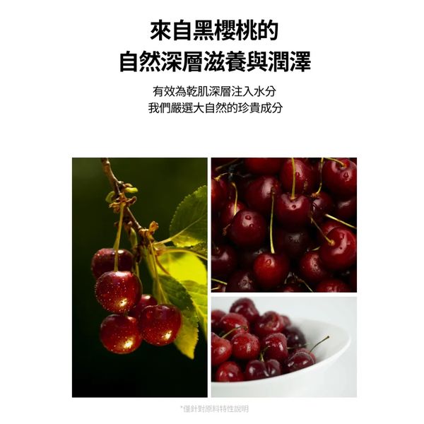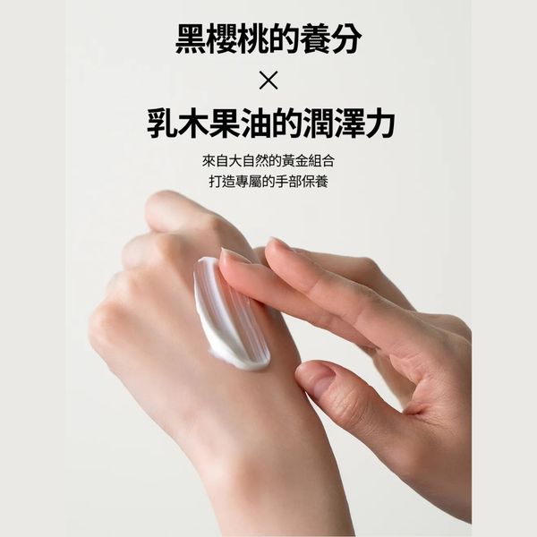 超級抗氧保濕力:來自黑櫻桃的花青素、多酚、維生素 A+C+E,幫助肌膚抗氧化、促進膠原生成,恢復手部彈嫩與光澤。