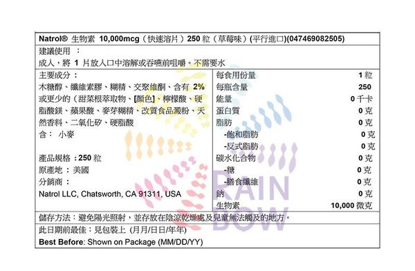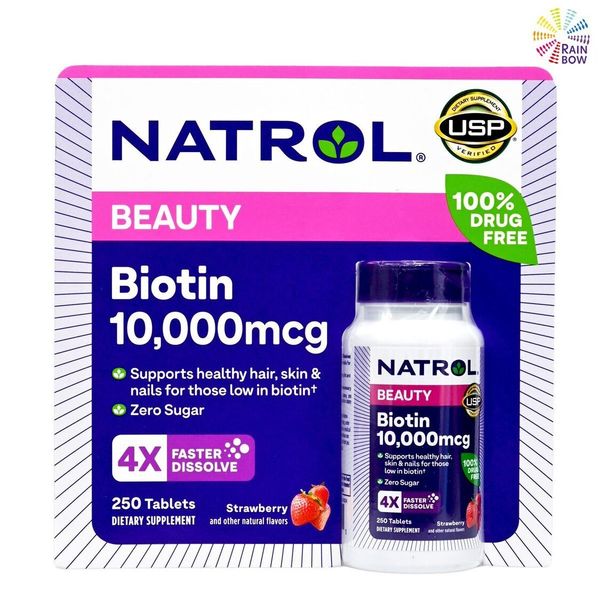 Natrol 獨特的溶解速度加快 4 倍特強配方可加快吸收,隨時隨地服用,不需要水。生物素,B 族維他命,也稱為維他命 H 或維他命 B7,不僅是頭髮、皮膚和指甲的重要營養素,還有助於將食物轉化為能量。臨床研究表明,缺乏生物素的人會脫髮和指甲變脆。