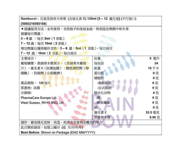Sambucol - 兒童黑接骨木果漿(含維生素C) 120ml[3 – 12 歲兒童]此日期前最佳:2027年4月底(0168)(平行進口)