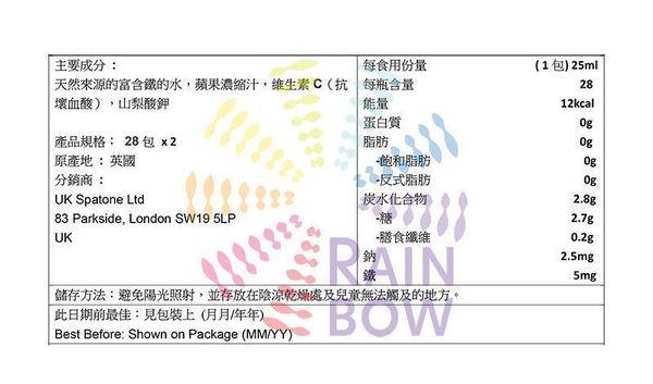-人體吸收率極高!-新版,口味更佳, 孕婦成份源自英國威爾斯北部SNOWDONIA高山泉水, 含豐富天然鐵質, 比一般合成鐵質更具活性及更易被人體吸收測試證實Spatone鐵水具有高達40%的吸收率. 而一般鐵丸只有3