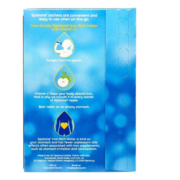 Spatone 已被驗證不會引起這些副作用配合100%天然蘋果汁, 味道清新可口獨立包裝, 方便衛生, 無需沖調, 直接飲用適合孕婦(產前產後), 小童(2歲以上), 及經期不適, 手腳冰冷等女士服用* 鐵是人體必需的礦物質元素. 它結合銅和蛋白質製造血紅蛋白, 形成紅血球,輸送氧氣供應身體所有組織所需. 鐵亦用作產生ATP, 為細胞提供能量主要成分:天然鐵質泉水, 天然濃縮蘋果汁, 維他命C適合:週期不適的女性, 孕婦, 產前或產後女性, 體質偏瘦, 食欲不掁, 過量失血,
