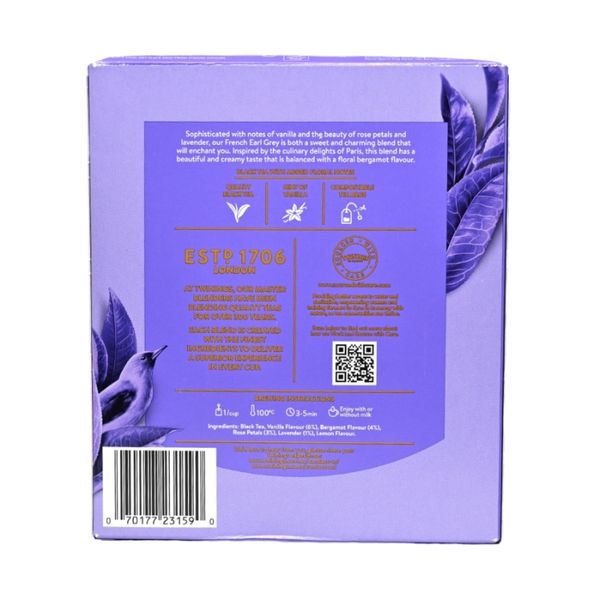 我們的法國伯爵茶帶有香草的香氣以及玫瑰花瓣和薰衣草的美麗,既甜美又迷人,會讓您著迷。靈感源自巴黎的美食,這款混合茶具有美妙的奶油味,與花香佛手柑味道相得益彰。