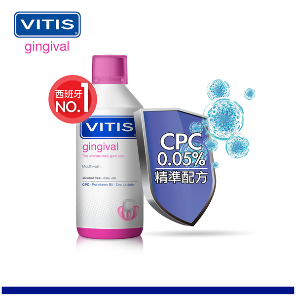 暢銷西班牙口腔護理*No.1品牌 VITIS®CPC漱口水,CPC 0.05%深喉殺菌配方,實証破壞菌毒脂肪膜**,配合ZincLactate延長殺菌功效,維他命原B5修護牙齦,尤其適合長者、孕婦、免疫力低人士、牙齦炎及牙周病患者等使用。