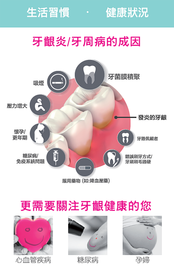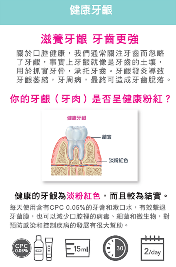 醫研實証,CPC能破壞病毒脂肪膜,有效減低新冠病毒唾液傳播。口腔隙縫殺菌全接觸 ,CPC可抑制牙菌膜。產品有效紓緩牙齦紅腫、出血不適、痱滋、口臭等問題。立即舒緩牙肉不適,及早修護牙齦,跟口腔菌毒說拜拜!