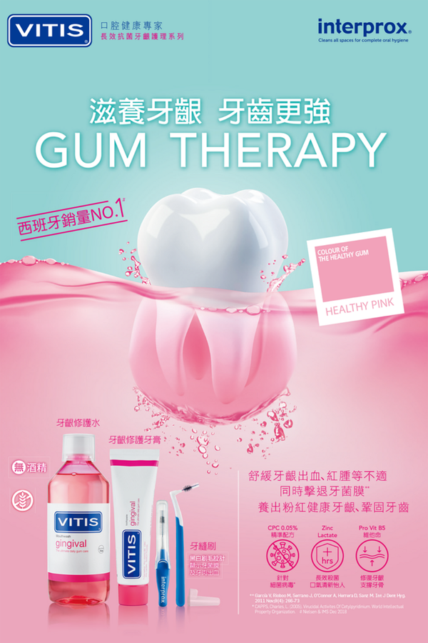西班牙 # No. 1 口腔護理品牌,VITIS®《衛達適》牙齦修護牙膏, 針對牙齦 [殺菌• 滋養• 堅固] 3保功能,獨有CPC 0.05%精準深喉殺菌配方,抑制細菌引致牙瘡、痱滋、紅腫不適 。Pro Vitamin B5維他命滋養牙肉,粉紅飽滿; 配合Zinc Lactate延長殺菌功效,增強牙肉防護,承托力強,全方位逆轉牙肉問題 。