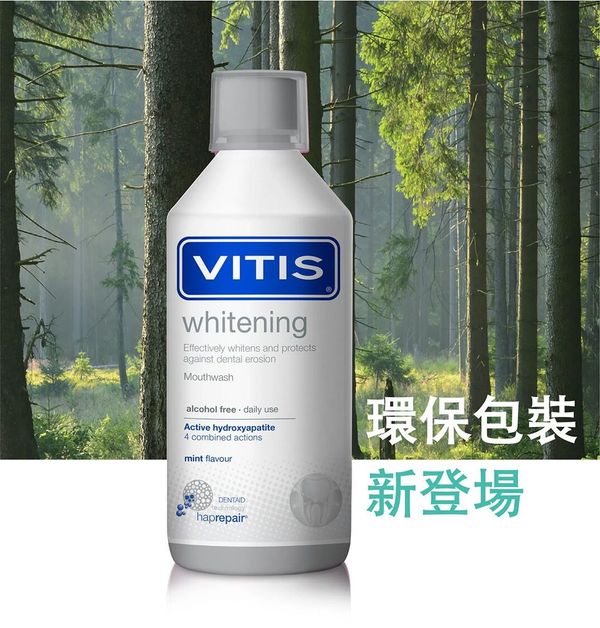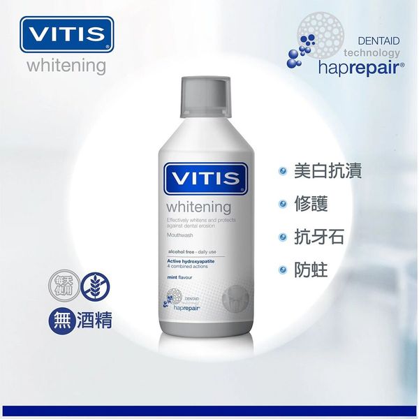 VITIS® 琺瑯質修護美白漱口水 500毫升專為有效美白和防止牙齒腐蝕而設計。