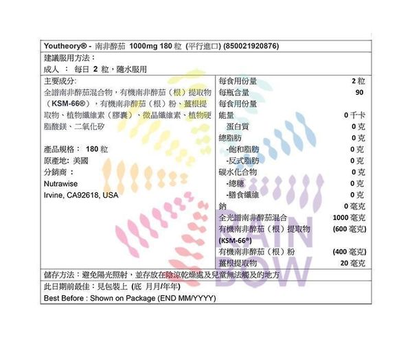 Youtheory-南非醉茄 1000mg 180粒 EXP: 2025年10月底(平行進口) (20876)